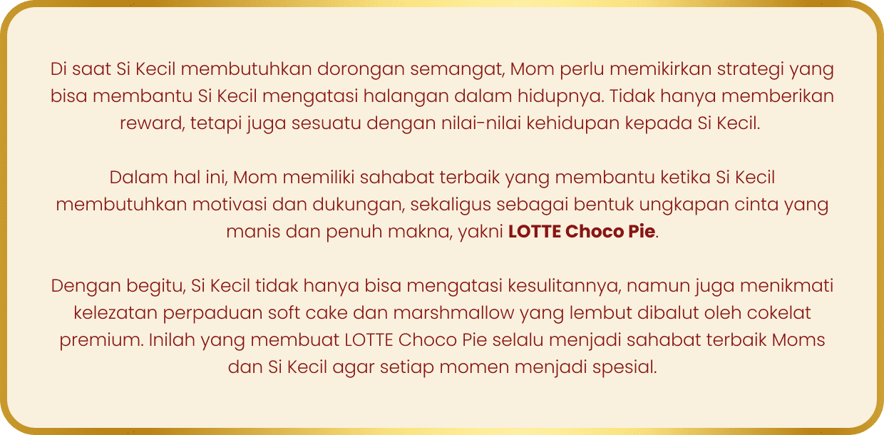 LOTTE Choco Pie juga menginspirasi Mom untuk mengapresiasi setiap pencapaian Si Kecil, baik besar maupun kecil, guna membantu tumbuhnya kepercayaan diri dan rasa bahagia bagi Si Kecil. Mom juga bisa mencari inspirasi kegiatan seru untuk dilakukan bersama Si Kecil dengan mengikuti berbagai aktivitas seru LOTTE Choco Pie.